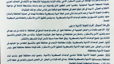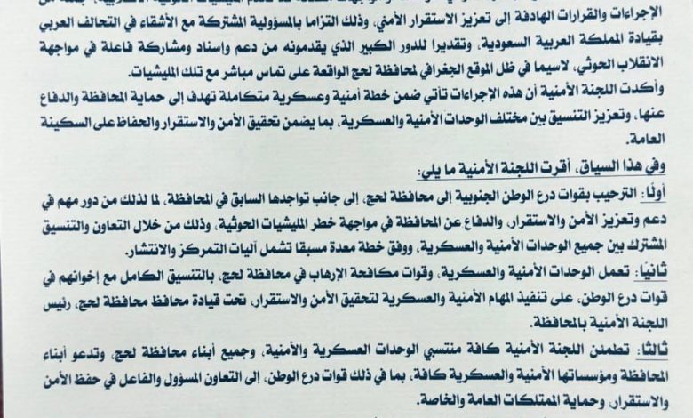 السلطة المحلية بمحافظة لحج تعلن دعمها للتحالف بقيادة السعودية وتعلن ترحيبها بقوات درع الوطن لدعم الأمن والاستقرار.
