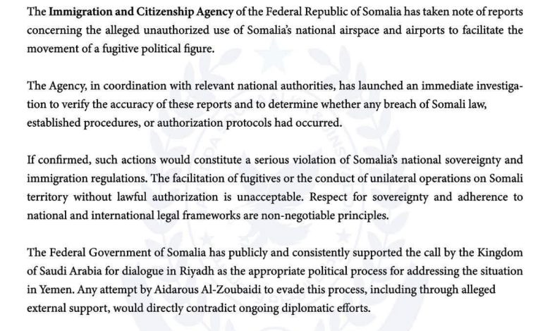 أعلنت هيئة الهجرة والجنسية في جمهورية الصومال الفيدرالية، اليوم، عن بدء تحقيقات فورية وشاملة حول تقارير تفيد باستخدام الإمارات العربية المتحدة للمجال الجوي والمطارات الصومالية لتسهيل تنقل شخصية سياسية “مطلوبة”، في إشارة إلى رئيس المجلس الانتقالي الجنوبي عيدروس الزبيدي.
