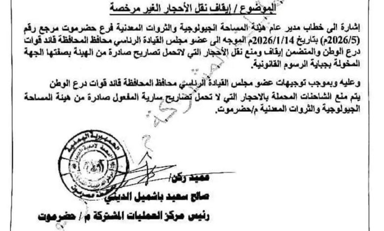 وجاءت العملية استجابةً لتوجيهات السلطة المحلية في حضرموت بضرورة تشديد الرقابة على الموارد الوطنية ومنع مرور أي شحنات لا تحمل تراخيص رسمية من هيئة المساحة الجيولوجية.