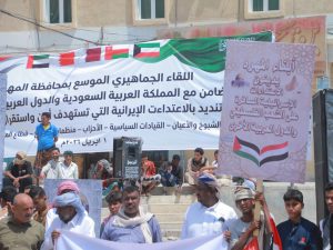 ورفع المشاركون أعلام الجمهورية اليمنية والمملكة العربية السعودية، ولافتات تضامنية عبّروا من خلالها عن دعمهم الثابت للسعودية ودول الخليج، وتأكيدهم رفض الهجمات الإيرانية التي تستهدف المنشآت الحيوية والمدنية وتهدد أمن واستقرار المنطقة، وإدانتهم للاعتداءات الإسرائيلية السافرة على الشعب الفلسطيني وعدد من الدول العربية الأخرى.