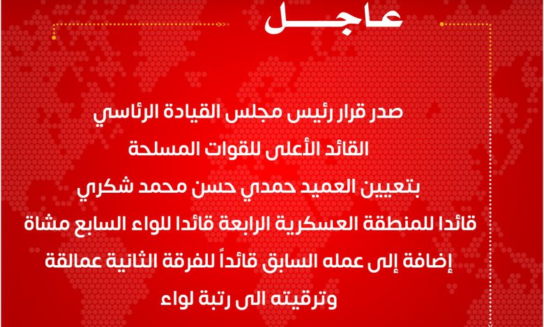 صدر قرار رئيس مجلس القيادة الرئاسي القائد الأعلى للقوات المسلحة بتعيين العميد حمدي حسن محمد شكري قائدا للمنطقة العسكرية الرابعة قائدا للواء السابع مشاة إضافة إلى عمله السابق قائداً للفرقة الثانية عمالقة