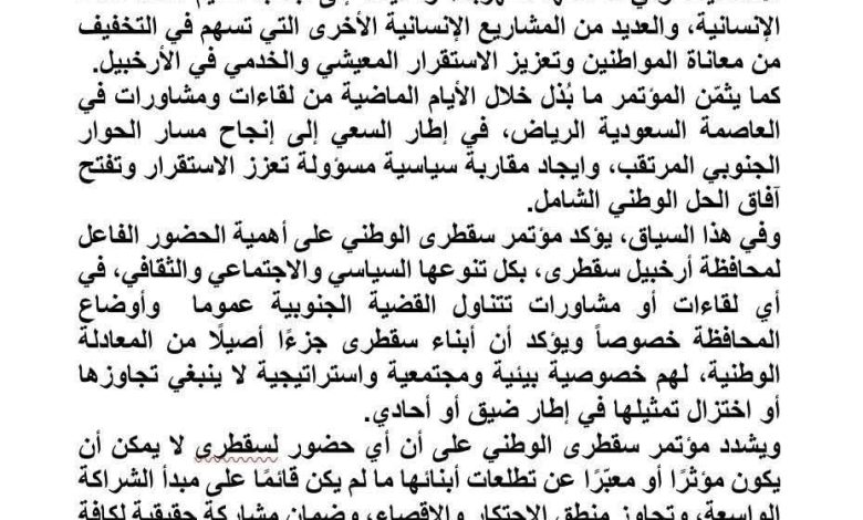 اختتم مؤتمر سقطرى الوطني بيانه بالتأكيد على أن المشاركة الحقيقية لكل أطياف المجتمع السقطري هي الضمانة الوحيدة لإنتاج رؤية جامعة تخدم استقرار الأرخبيل، وتحفظ وحدة الوطن وأمنه ومستقبله.
