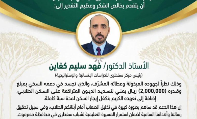 وقد لاقت هذه المبادرة ترحيباً واسعاً وتقديراً كبيراً من قبل منتدى طلاب سقطرى الجامعي في حضرموت، الذي عبّر عن خالص شكره وعظيم امتنانه للدكتور كفاين والمركز على وقوفهم مع الطلاب ودعمهم السخي ، وفي بيان له، أكد المنتدى أن “هذا الدعم قد ساهم بصورة كبيرة في تذليل الصعاب أمام أبنائكم الطلاب، وفي سبيل تحقيق رسالتنا وأهدافنا السامية لضمان استمرار المسيرة التعليمية لشباب سقطرى في محافظة حضرموت”.
