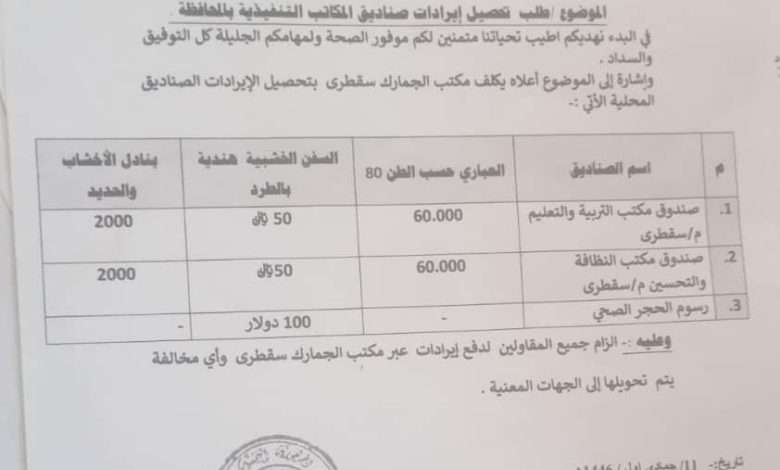 الوثيقة، المؤرخة في 2 نوفمبر 2025، وجّهت مدير عام مكتب الجمارك بتحصيل مبالغ محددة من المقاولين على واردات مواد مثل الأخشاب والحديد (تحت بند العباري وبنادل) لصالح: صندوق مكتب التربية والتعليم م/سقطرى و صندوق مكتب النظافة والتحسين م/سقطرى ورسوم الحجر الصحي (بالدولار).