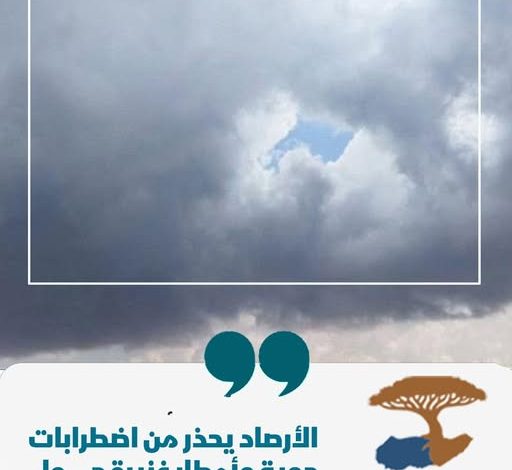 حذّر المركز الوطني للأرصاد الجوية من تأثر أرخبيل سقطرى والمياه الإقليمية الشرقية للبلاد بمنخفض جوي مصحوب بأمطار متفاوتة الشدة ورياح نشطة، وسط اضطراب متزايد في حالة البحر.