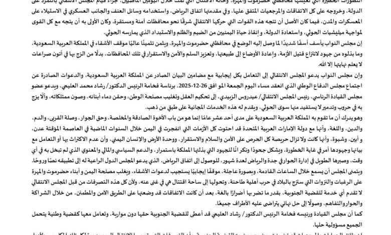 واختتم مجلس النواب بيانه بالتأكيد على الدور المحوري للمملكة العربية السعودية في إيقاف “التهور” وإنقاذ المحافظات الشرقية، مشدداً على أن تنفيذ اتفاق الرياض “نصاً وروحاً” هو العلاج الناجع للأزمة القائمة.