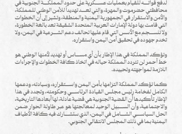 وفي خطوة تعزز من سلطة الدولة، أعلنت المملكة تأييدها الكامل لمطالب الحكومة اليمنية بضرورة خروج القوات الإماراتية من الأراضي اليمنية خلال 24 ساعة، ووقف كافة أشكال الدعم المالي أو العسكري لأي أطراف تعمل خارج إطار الدولة.
