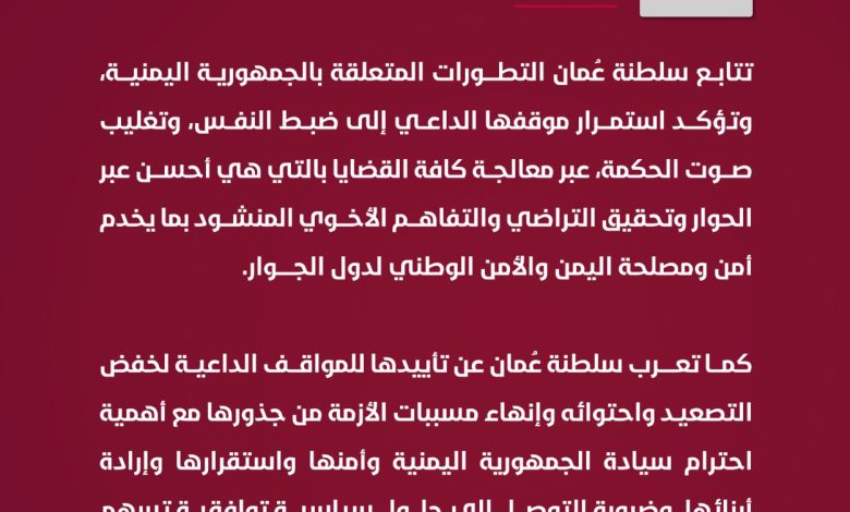 #بيـان | تتابع سلطنة عُمان التطورات المتعلقة بالجمهورية اليمنية، وتؤكد استمرار موقفها الداعي إلى ضبط النفس، وتغليب صوت الحكمة، عبر معالجة كافة القضايا بالتي هي أحسن عبر الحوار وتحقيق التراضي والتفاهم الأخوي المنشود بما يخدم أمن ومصلحة اليمن والأمن الوطني لدول الجوار.